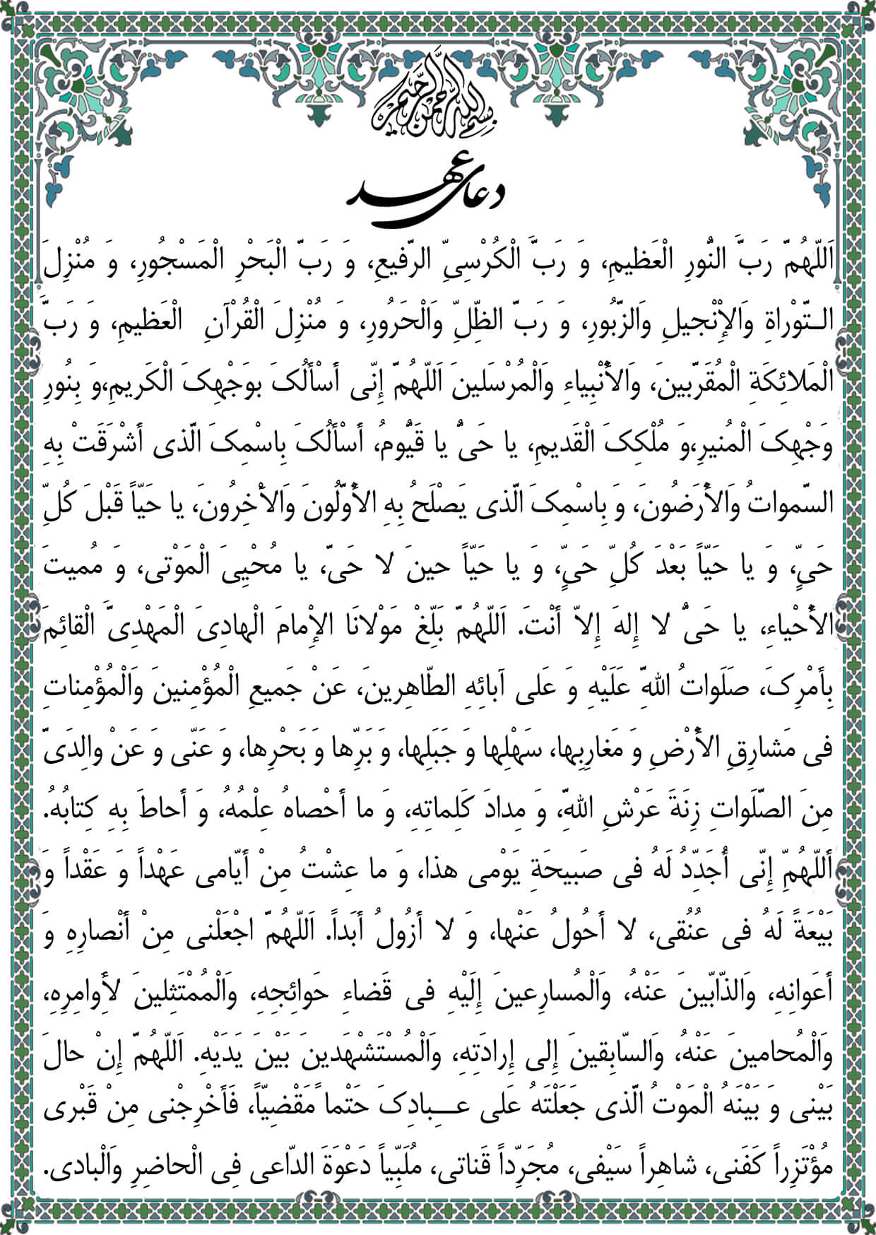 پروردگارا ای رب نور حقیقی وجود کامل و خداوند کرسی با رفعت و خداوند دریای احسان و ای نازل کننده ی کتاب آسمانی تورات موسی(ع) و انجیل عیسی (ع)و زبور داود(ع) و ای پروردگار سایه و آفتاب گرم و ای نازل کننده ی قرآن عظیم الشان و ای پروردگار ملائک مقرب و پیغمبران و رسولان پروردگارا همانا از تو درخواست میکنم به حق ذات بزرگوارت و به نور جمالبی مثالت که عالم به آن روشن است و به ملک قدیم و سلطنت ازلیت ای زنده ی ابدی و ای پاینده ی سرمد از تو درخواست میکنم به حق آن اسمی که آسمان ها و زمین را به آن اسم نور وجود بخشیدی و به آن اسمی که اولین و آخرین اهل آلم را بدان اصلاح و تربیت دادی ای زنده ی پیش از هر زنده ای زنده ی ابدی بعد از هر زنده ای زنده هنگامی که احدی زنده نبود ای زنده کننده ی مردگان و میراننده ی زندگان عالم ای زنده بالذات که غیر تو خدایی نیست پروردگارا تو بر مولای ما حضرت امام عصر هادی امت و مهدی آل محمد قیام کننده به فرمان تو که درود خدا بر او وبر پدران پاک گوهر او باد از تمام مرد و زن اهل ایمان که در مشرق و مغرب های زمین هستند و در صحرا و کوه و بر و بحر عالمند از من و پدر و مادر من بر او درود و تحیتی فرست برابر عرش خدا و به قدر مداد کلمات حق و آنچه که علم خدا احصا و کتاب آفرینش حق احاطه بر آن نموده است پروردگارا من در صبح همین روزم و تمام ایامی که در آن زندگانی کنمبا او تجدید میکنم عهد خود و عقد بیعت او را که بر گردن من است که هرگز از این عهد و بیعت بر نگردم و تا ابد بر آن ثابت قدم باشم پروردگارا مرااز انصار و یاران آن بزرگوار قرارده و از آنان که از او دفاع میکنند و از پی انجام مقاصدش میشتابند و اوامرش را ماتثال و از وی حمایت کرده و به جانب اراده اش مشتاقانه سبقت میگیرند و در حضور حضرتش به درجه ی رفیع شهادت میرسند مرا از آنان مقرر فرما پروردگارا اگر میان من واو موت که بر تمام بندگانت قضای حتمی قرار داده ای جدایی افکند پس مرا از قبر بر انگیز در حالی که کفنم را ازار خود کرده و شمشیرم زا از نیام بر کشیده و لبیک گویان دعوتش را که بر تمام مردم شهر و دیار عالم لازم الاجابه است اجابت کنم ای خدا به ما آن طلعت زیبای رشید را بنما و از پرده ی غیب پدیدیار کن و سرمه ی نور و روشنی ابد به یک نظر بر آن جمال مبارک به چشم من درکش و و فرج آن حضرت را نزدیک و خروجش را آسان ساز و توسعه در طریق وی عطا فرما ومرا به طریقه ی با حجت و بیان او سلوک ده و فرمان آن حضرت را نافذ گردان و پشت او را قوی ساز و ای خدا شهر و دیارت را به وجود او معمور ساز و بندگانت را به واسطه ی او زنده ساز چون تو خود فرموده ای و کلام تو حق و حقیقت است فرمودی (ظهر الفساد فی البر و البهر بما کسبت ایدی الناس )